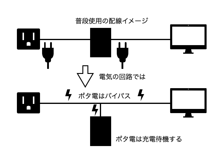 ポタ電を使用した際のUPS挙動はバイパスが主
